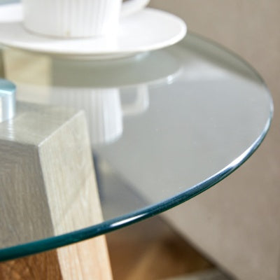 Modern And Practical Round Table. Made Of Clear Tempered Glass Top And Wood-coloured MDF Material. Suitable For Living Rooms And Bedrooms