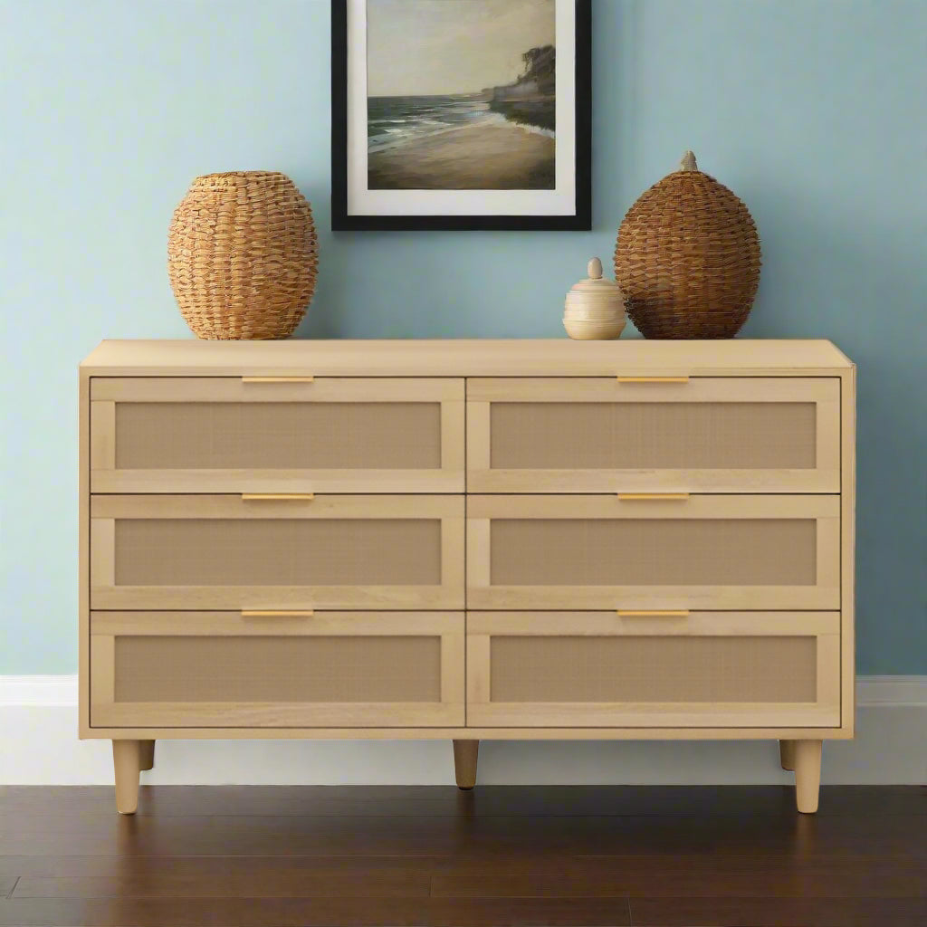51.18" 6 Drawer Rattan Locker Rattan Drawer with White Drawer Slide for Bedroom, Living Room, Natural Color